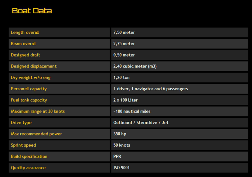 | 總長: | 7.50m | 航速: | 50kn |