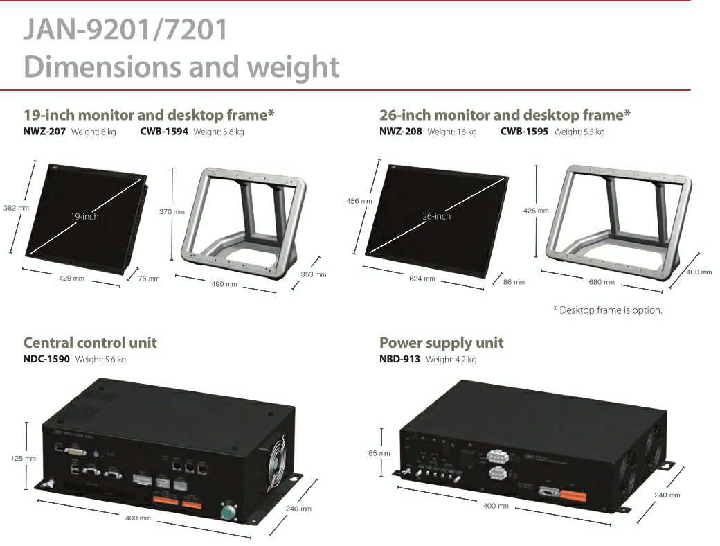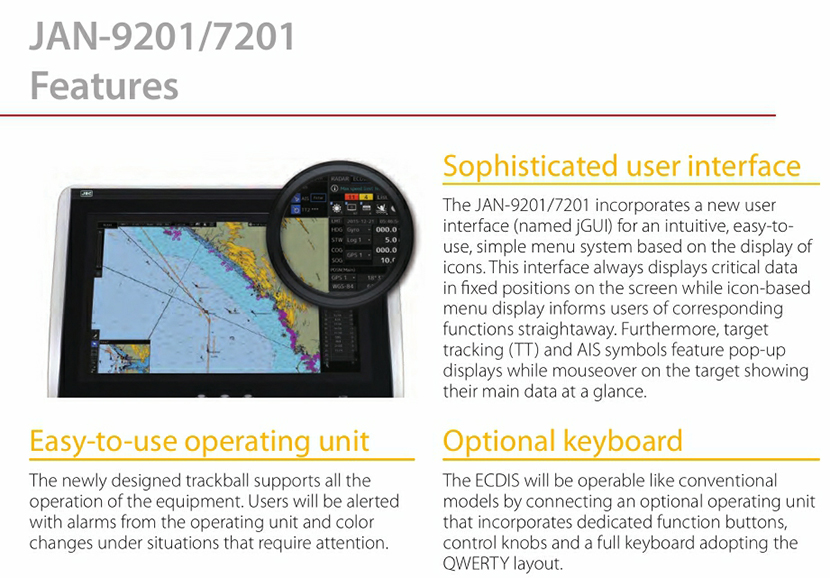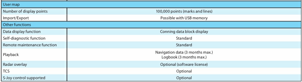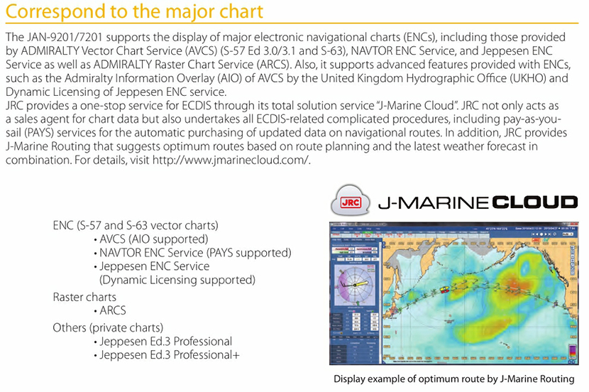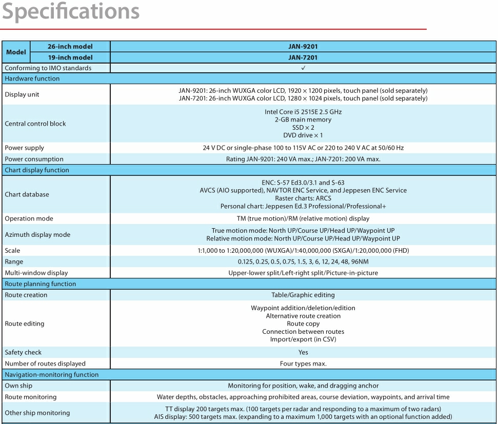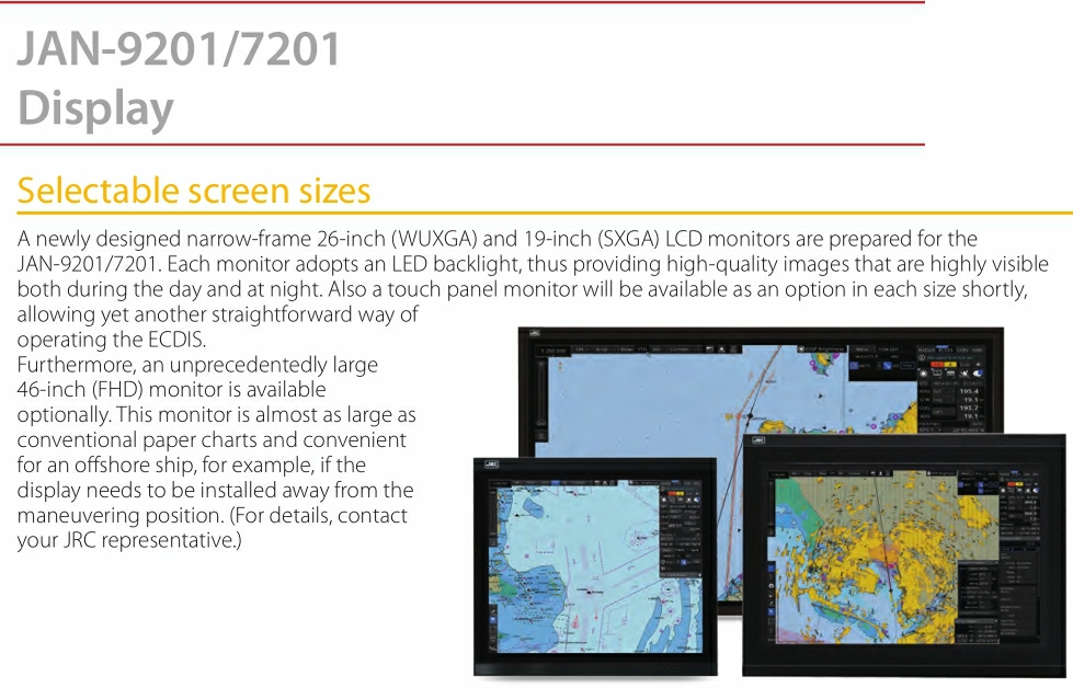 顯示單元: 26英寸 電子海圖庫: ENC S-57 Ed3.0/3.1 and S-63 AVCS (AIO supported), NAVTOR ENC Service, and Jeppesen ENC Service Raster charts- ARCS Personal chart-Jeppesen Ed.3 Professional/Professional+