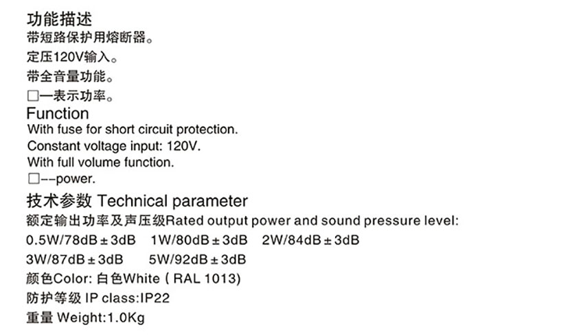 功率: 0.5W 聲壓等級: 78dB