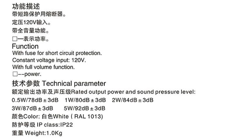 功率: 0.5W 聲壓等級: 78dB