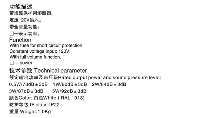 | 功率: | 5W | 聲壓等級: | 92dB |