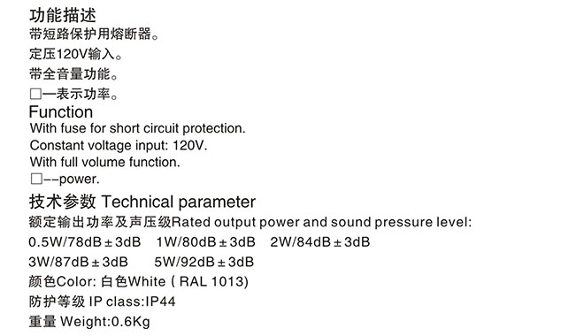 | 功率: | 5W | 聲壓等級(jí): | 92dB |