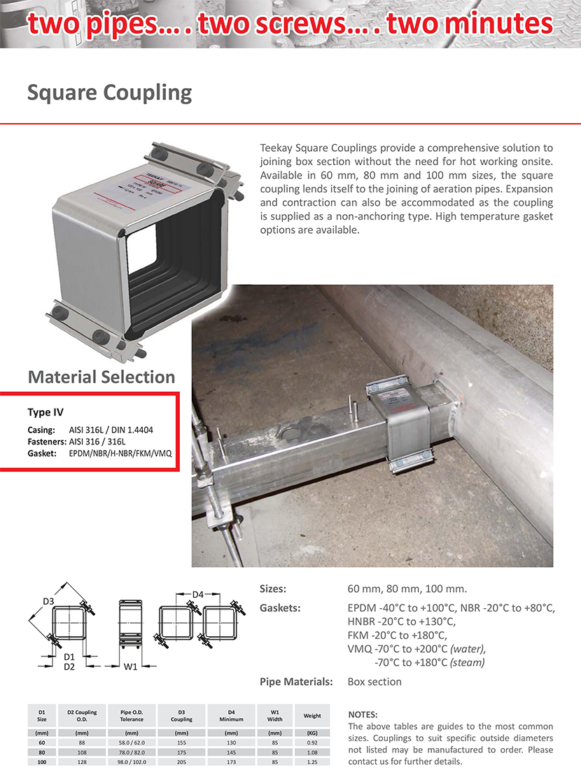 性能亮點: 可用于箱型斷面連接,無須現場高溫作業;管道脹縮適應性強;安裝簡單快捷;耐高溫墊片可選 外徑允差: -2/+2mm