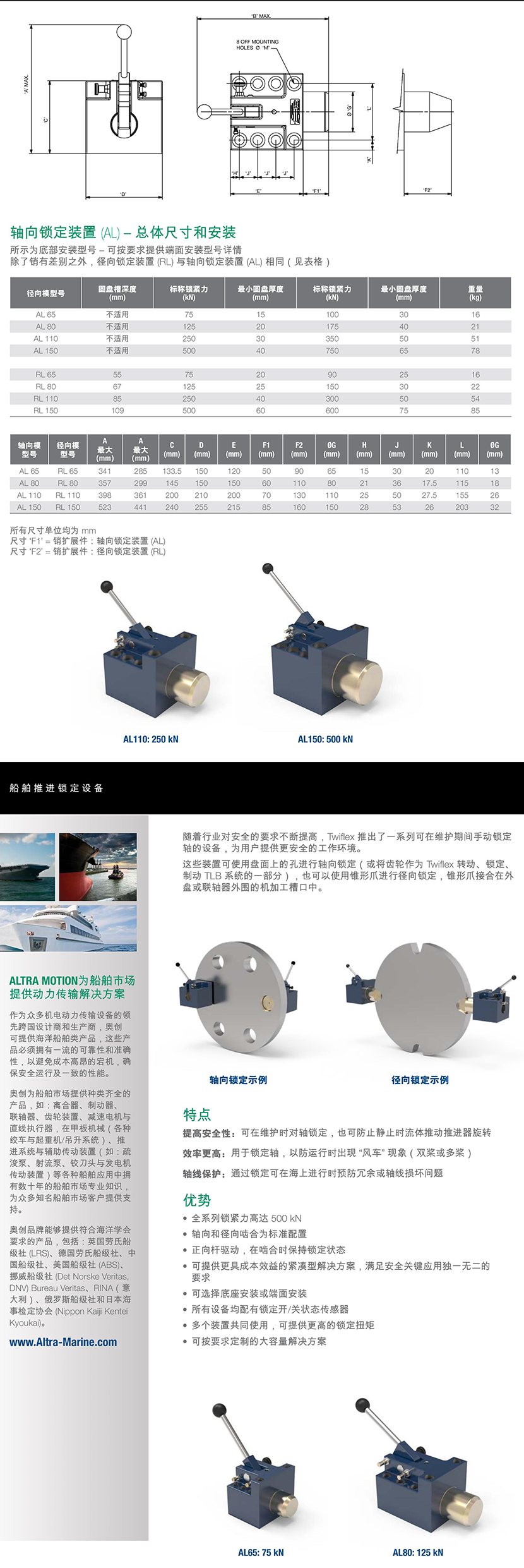 安裝方式: 底座安裝/端面安裝 性能亮點: 軸向和徑向嚙合為標準配置;正向桿驅動,在嚙合時保持鎖定狀態;可在維護時對軸鎖定,也可防止靜止時流體推動推進器旋轉;用于鎖定軸,以防運行時出現“風車”現象(雙槳或多槳);通過鎖定可在海上行進時預防冗余或軸線損壞問題;所有設備均配有鎖定開/關狀態傳感器;多個裝置共同使用,可提供更高的鎖定扭矩
