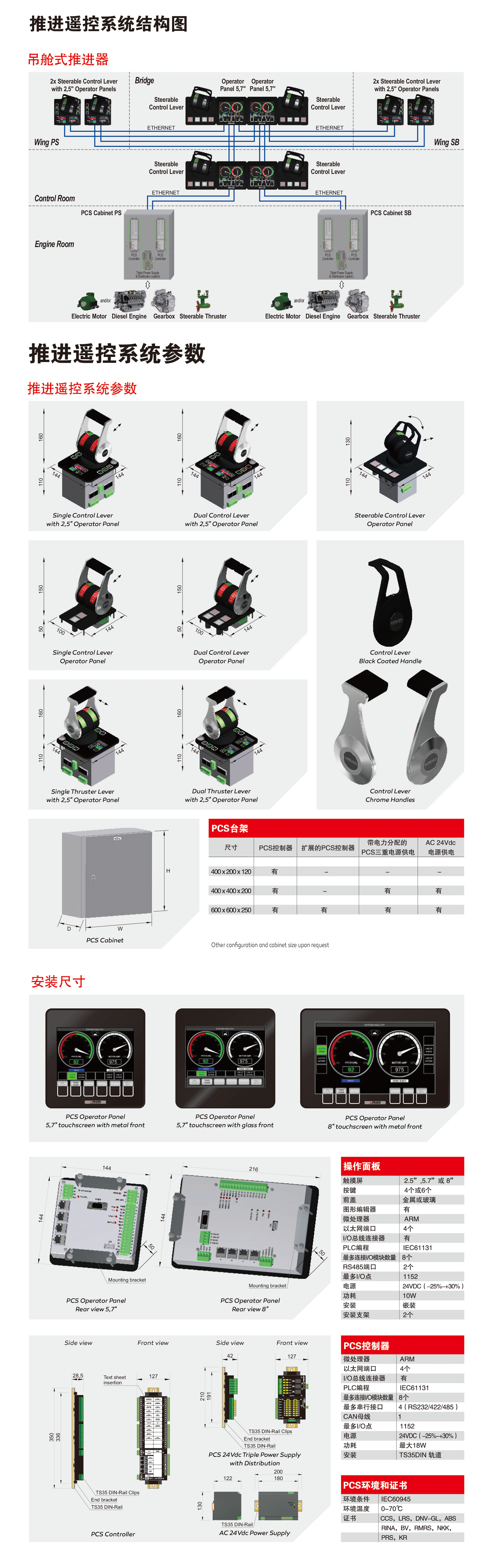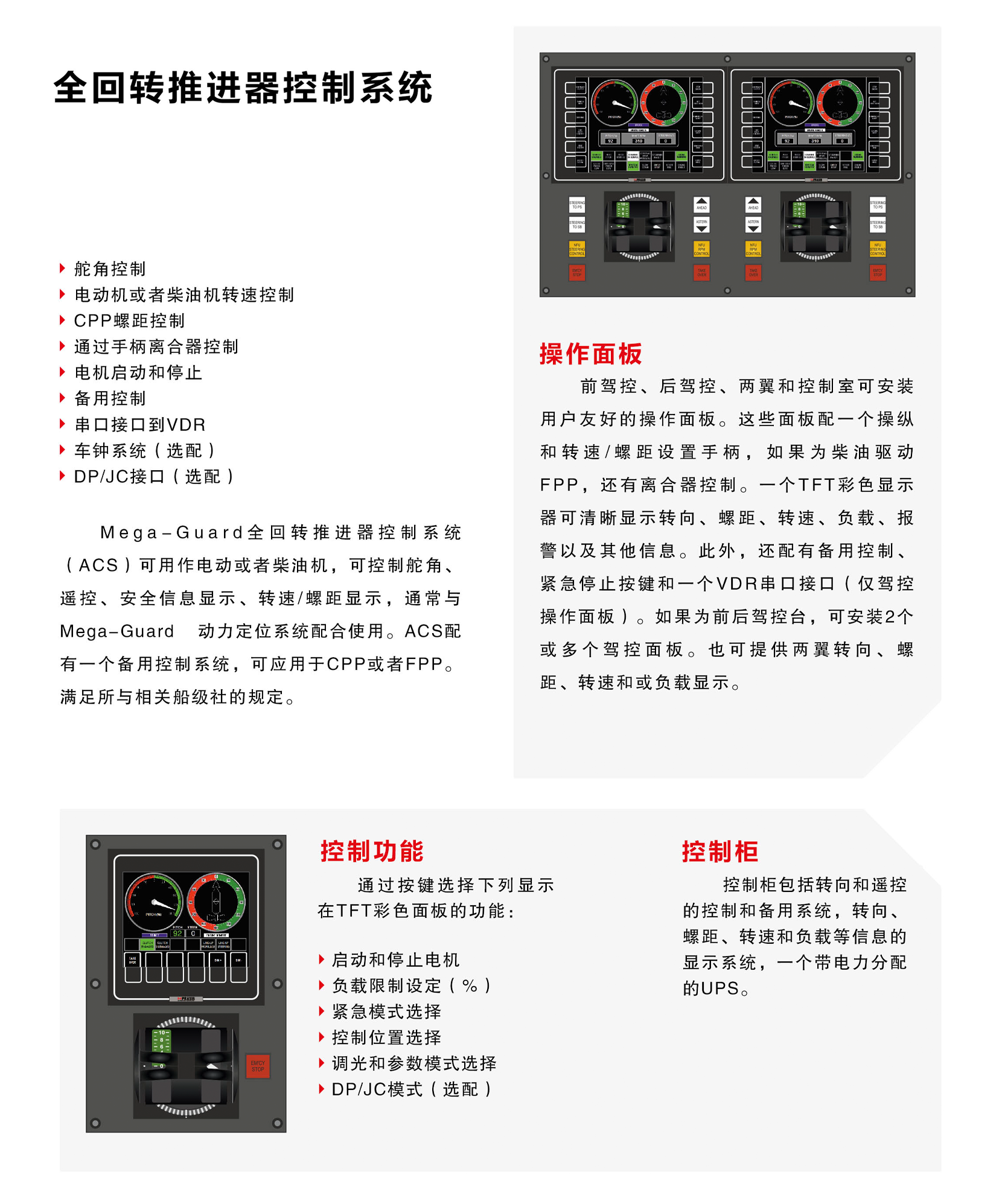 電動機與柴油機均適用;可控制舵角、遙控、安全信息顯示、轉速/螺距顯示;配有一個備用控制系統,可應用于CPP或者FPP;用戶界面友好,易操作