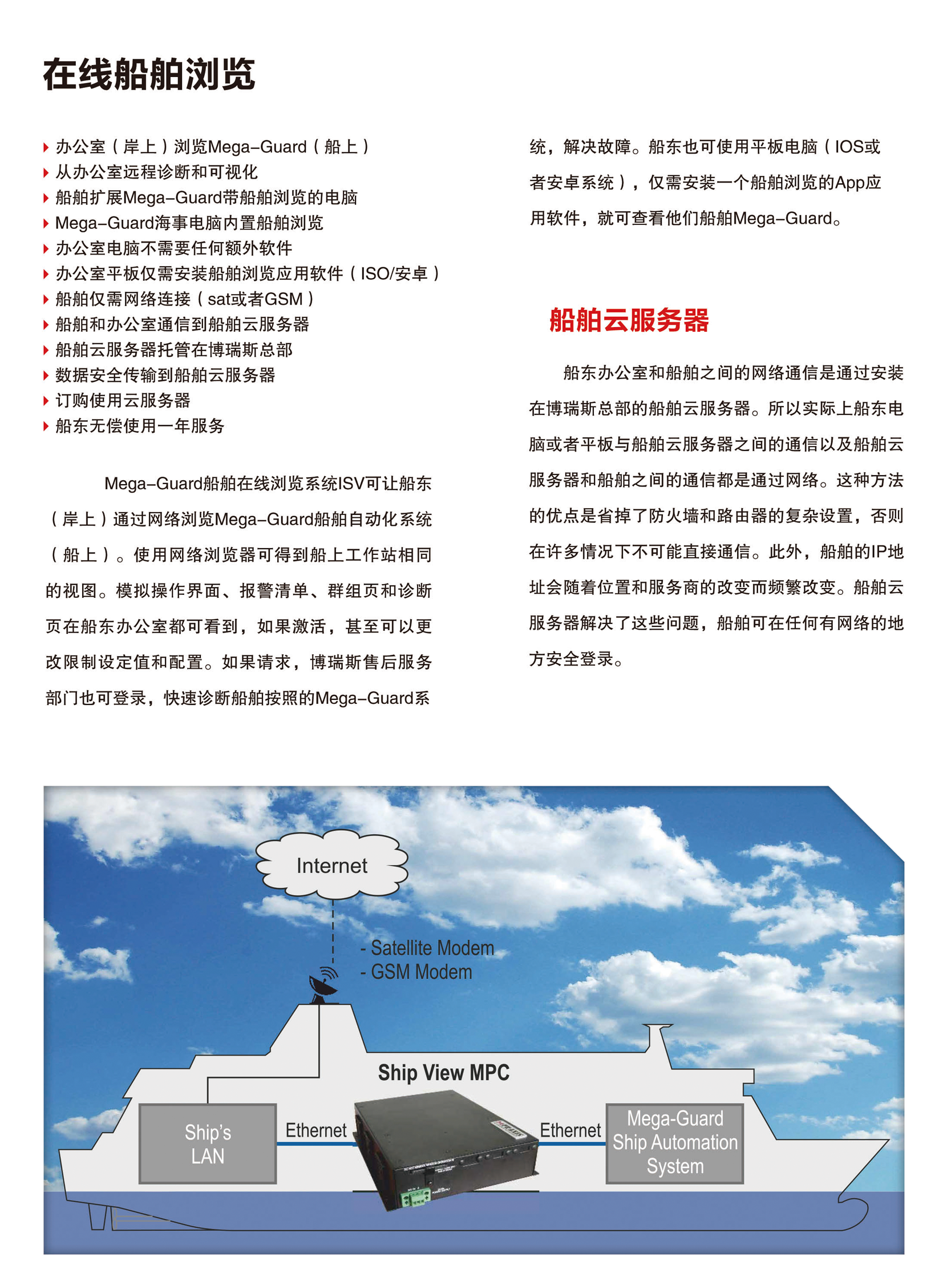 | 系統(tǒng)特點: | 可從岸上瀏覽船上的Mega-Guard 系統(tǒng) ,實現(xiàn)遠程診斷和可視化,可得到與船上工作站相同的視圖;電腦不需要任何額外軟件,平板電腦(10S或 者安卓系統(tǒng))僅需安裝一個船舶瀏覽的App應(yīng)用軟件,就可查看他們船舶Mega-Guard;在保證數(shù)據(jù)安全的情況下,可自動省去防火墻和路由器的復(fù)雜設(shè)置,船舶可在任何有網(wǎng)絡(luò)的地方安全登錄該軟件;船東無償使用一年 | ||
